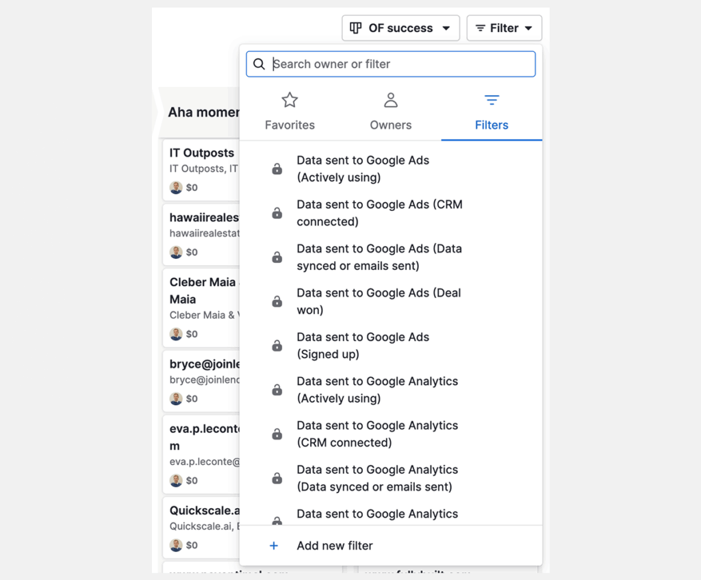 Click “Save”. When you select this filter for your pipeline, you won’t see any deals yet. That’s normal as you need to set up automations to populate these field values when deal stages change.
