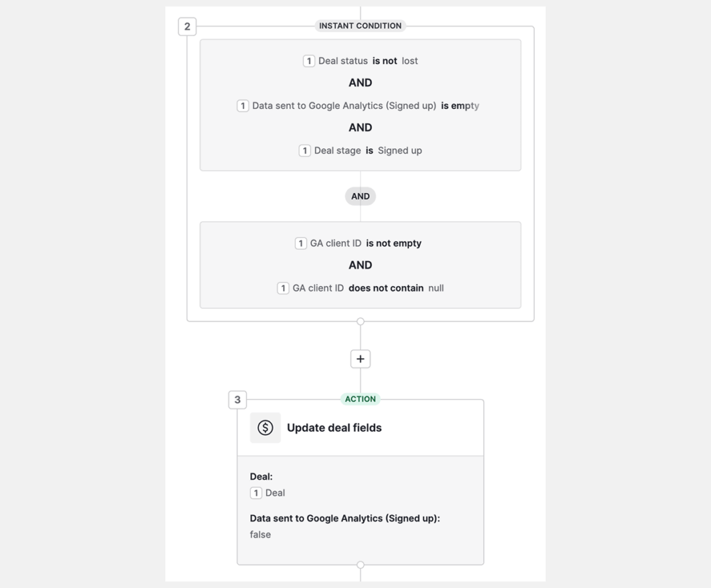 Note: For automations targeting won deals, change “Deal status” to “is won” and remove the “Deal stage” condition under the Instant Condition block.