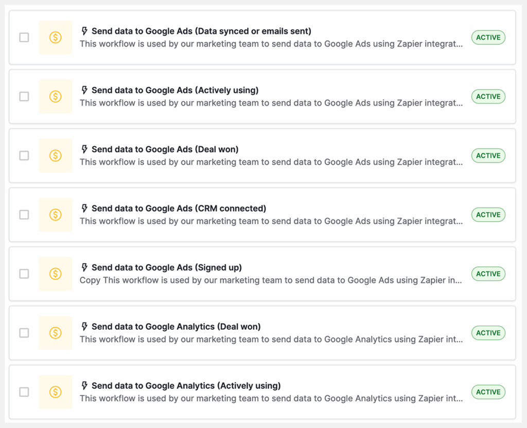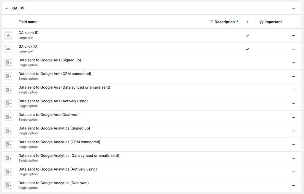 Each named after its corresponding deal stage. We have created separate fields for both Google Ads and Google Analytics because we send offline conversions to both Google Ads and events to GA4. We will be using Signed up and Deal won as examples in this article.