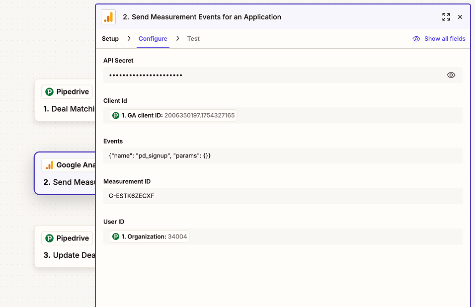 Choose Pipedrive as the app and select “Update Deal” for the action. In the Configure tab, choose your Deal ID value, then scroll down to find your previously created field name. Select the field corresponding to the deal stage you’re sending events for and set the value to “true”.