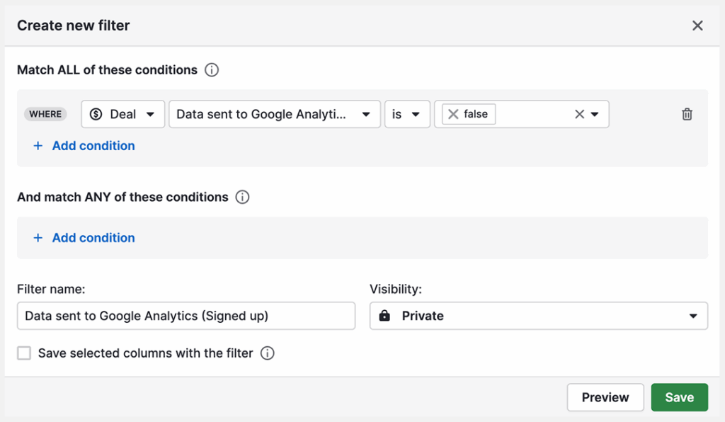 A modal window will appear. Select one of the deal fields you just created and set the condition to “false”. Name the filter after the property name to avoid confusion later. Repeat this process for each field you created.