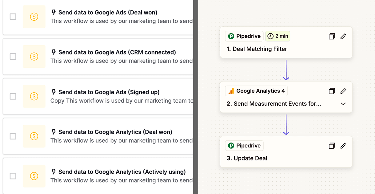You’ll now integrate Pipedrive to Google Ads to send offline conversions. This section reuses the same deal filters and true/false stage flags you created earlier and the only change is swapping the GA4 step for a Google Ads step.