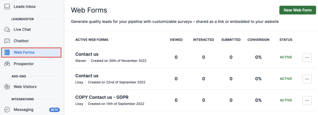 Broadly, there are six main web form options that can be used with Pipedrive: