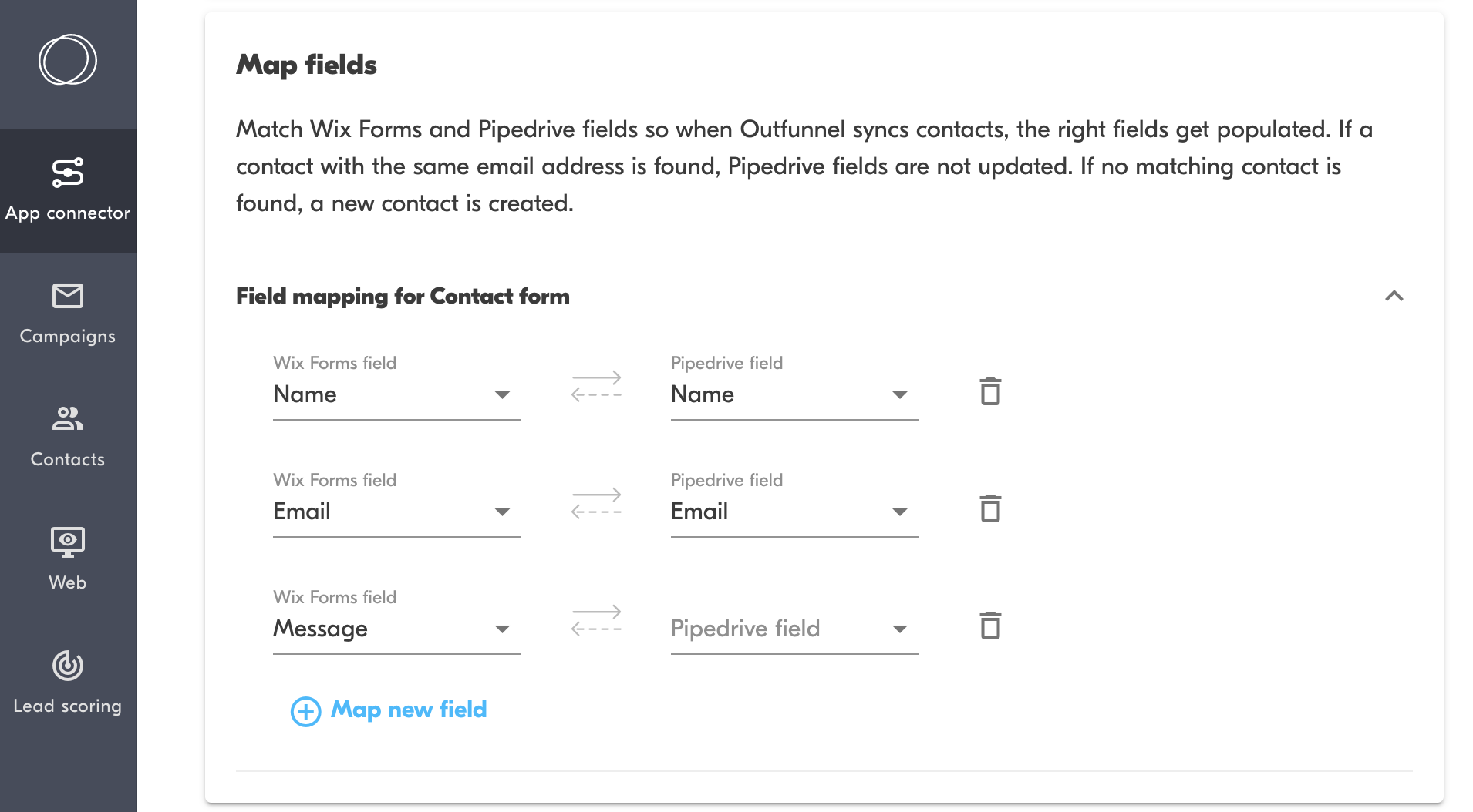 How it works: integrate Pipedrive and any one of your Wix web forms via Outfunnel in less than 15 minutes, and whenever someone fills a form, the contact record is created in Pipedrive automatically, along with key data about the form submission.