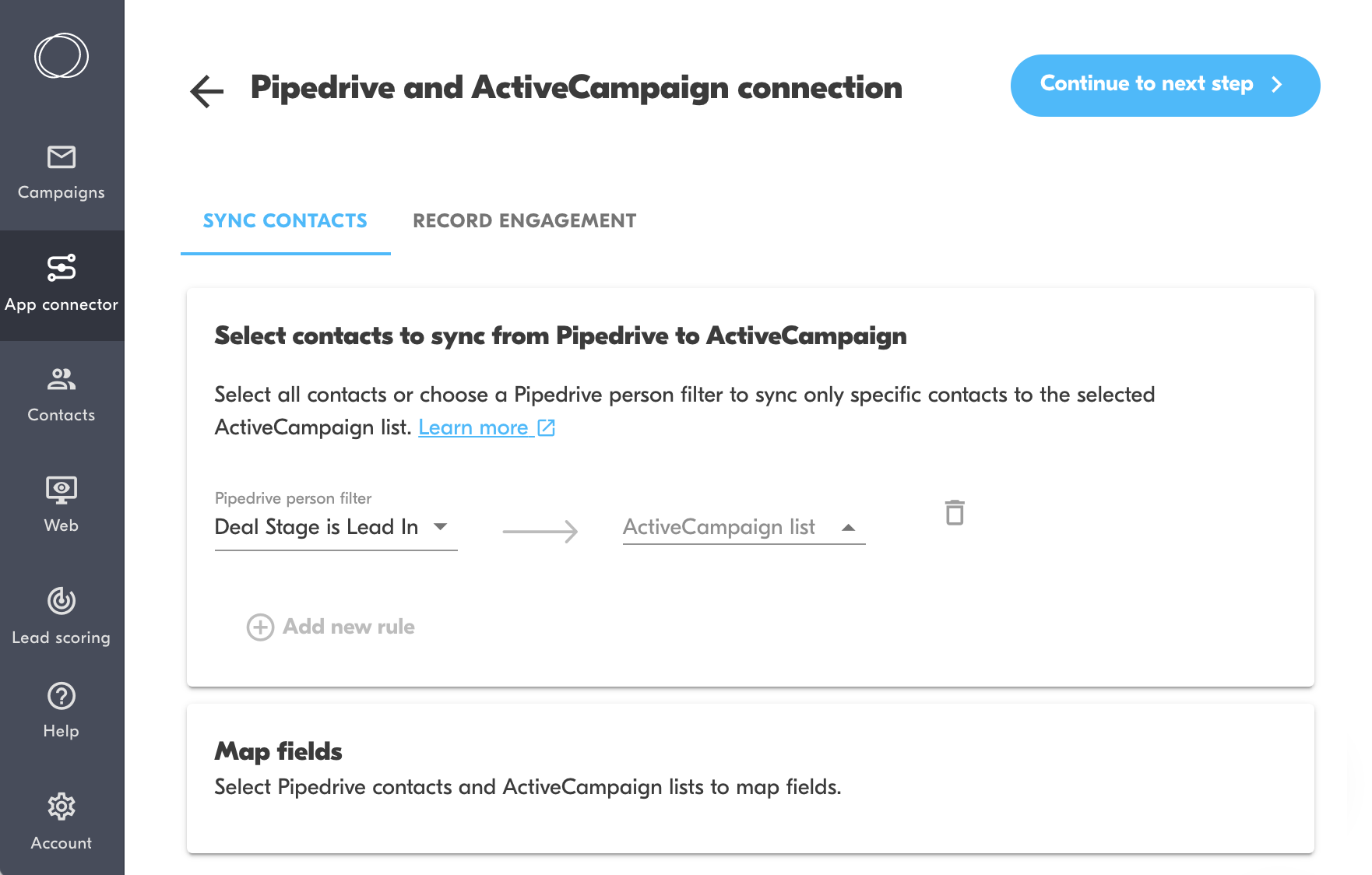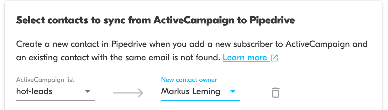 Configure the integration to sync new ActiveCampaign subscribers to Pipedrive as contacts.