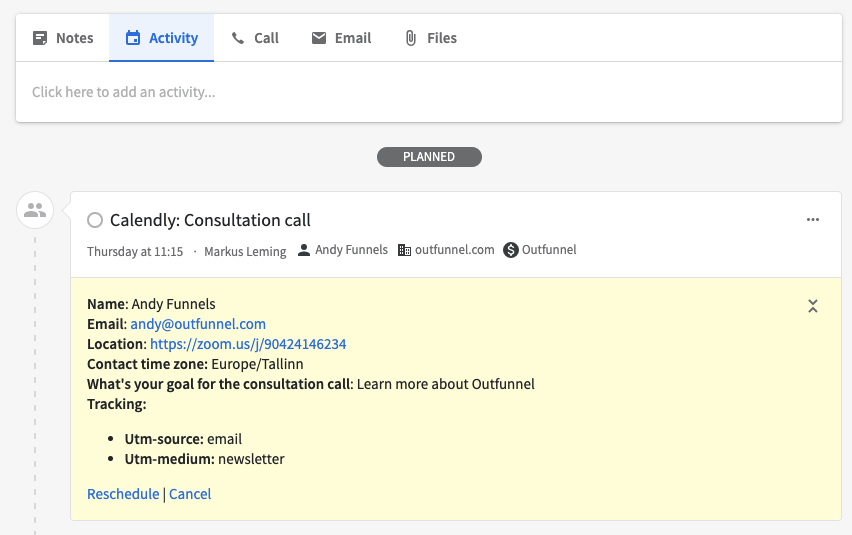 How it will work: Whenever a Calendly meeting is canceled or rescheduled, the activity in Pipedrive will be updated accordingly.