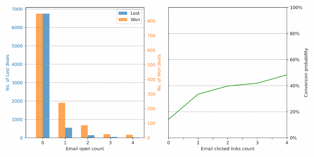 Learning 1: email opens are a pretty good signal for predicting deal conversion, and email clicks are a strong signal