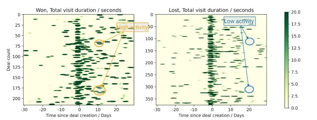 We also wanted to see how visiting a company’s website correlates with conversions. The following two heatmaps are comparisons between the two customer classes, specifically their total time spent on our website before and after deal creation in CRM.