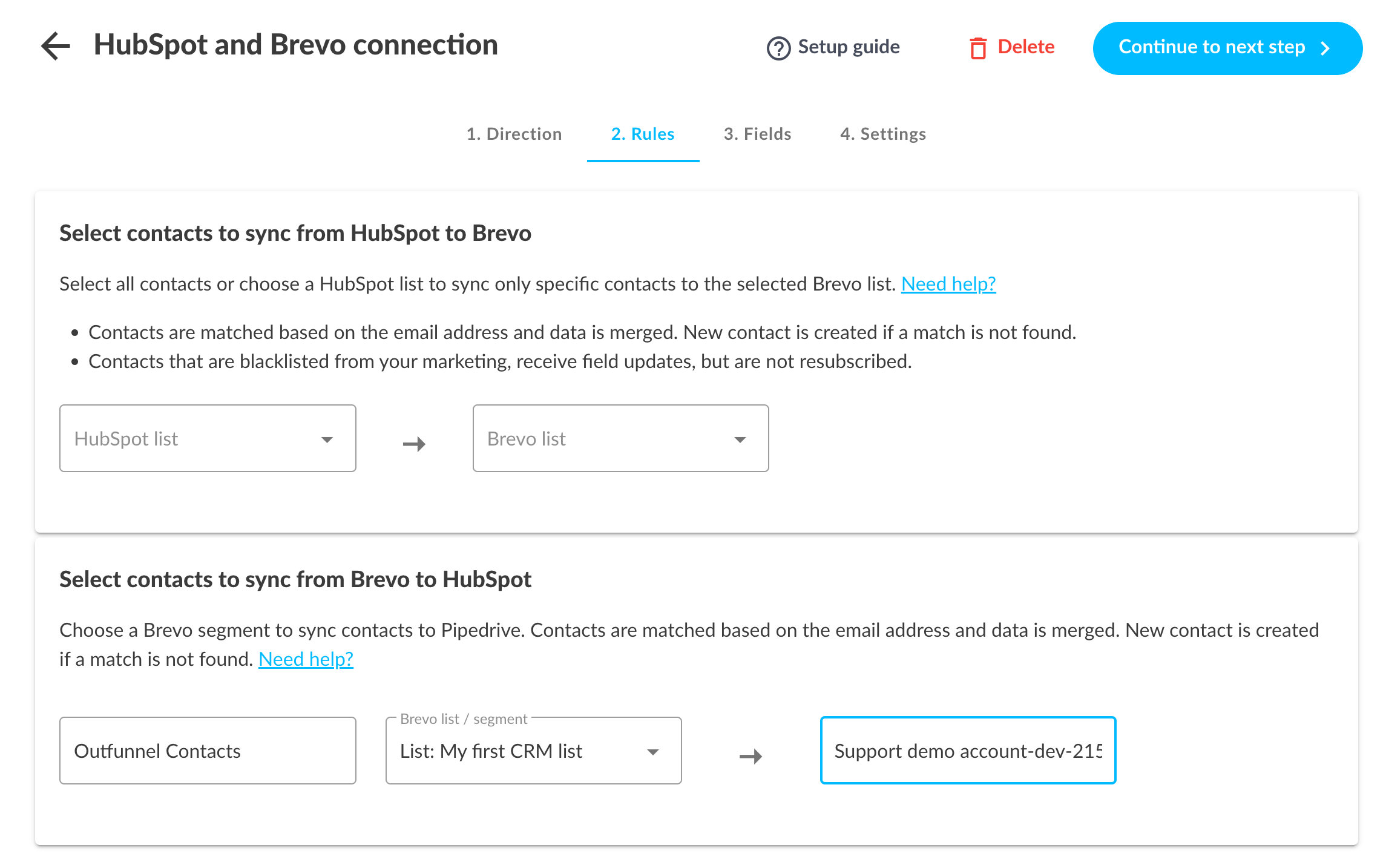Sync all contacts or use HubSpot lists and Brevo segments to define which contacts are synced between the apps.