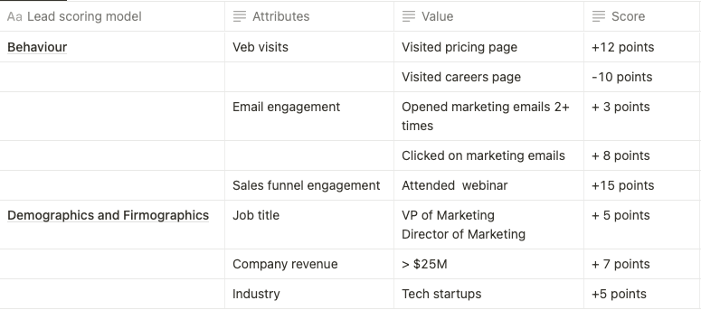 Using the insights from your data, sales, and customers, list out key actions and attributes that indicate a lead is a good fit and actively buying. Then assign a score to each.