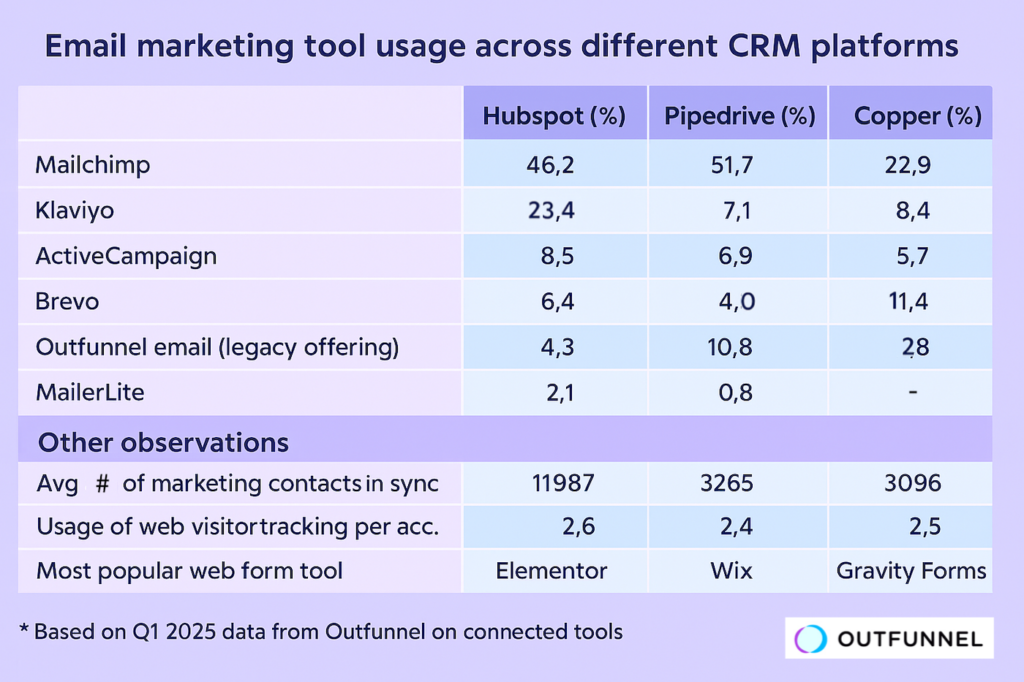ActiveCampaign and Brevo (formerly known as Sendinblue) show similar usage levels overall across Outfunnel’s user base. But dig a little deeper and you’ll notice an interesting twist Brevo is relatively more popular among Copper users.
