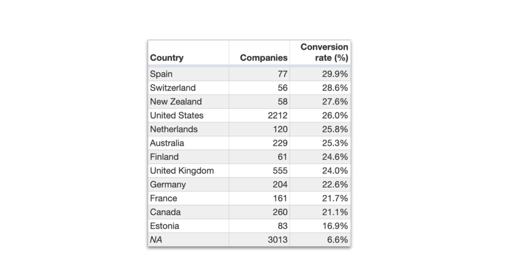 At the bottom of the list is NA, which stands for not available, not North America. The biggest bucket in terms of locations, roughly 35% of all companies added to our CRM, is one where Clearbit wasn’t able to determine a location. And it seems that a mere 6.6% of signups like this convert to paid, nearly 3 times less than our average.