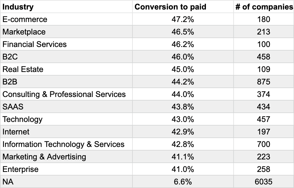So the first thing that’s a bit odd is that all industries have a higher conversion to paid than our average (the red line on the graph).